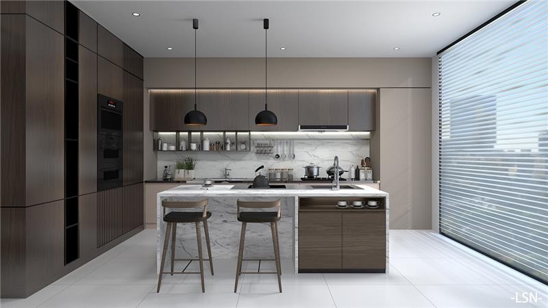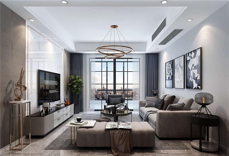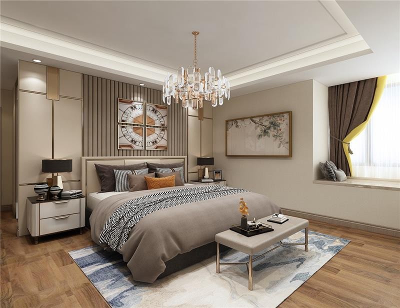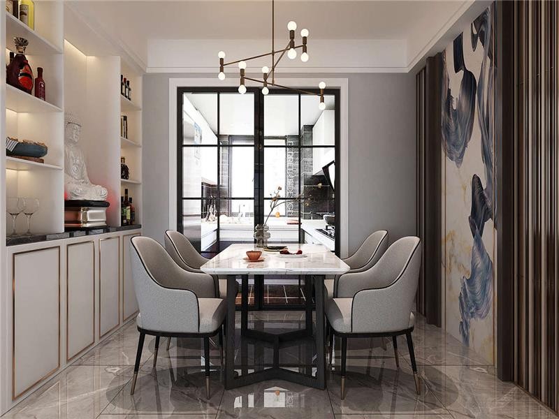 空间设计整体色深浅呼应,柔和而饱满的空间层次精致大气。背景墙使用雅士白拼接,用石材的纹理来表达空间的轻奢;现代家具配上金属质感的灯具,让每一个踏入此空间的过客渴望这里过一段有别于以往的生活。