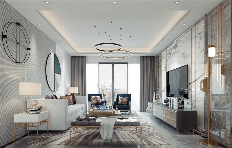 屋主喜欢高级干净的感觉,整体365老玩家入口_bet3365info_下载365 定义为现代365老玩家入口_bet3365info_下载365 ,色调以白色为主。电视墙铺设大理石,尽显高级,吊灯挂饰采用几何圆形,大气而别致,软装主色使用白色,静谧蓝做提亮,整个空间看起来大气而高级。